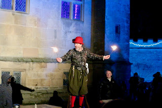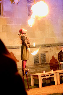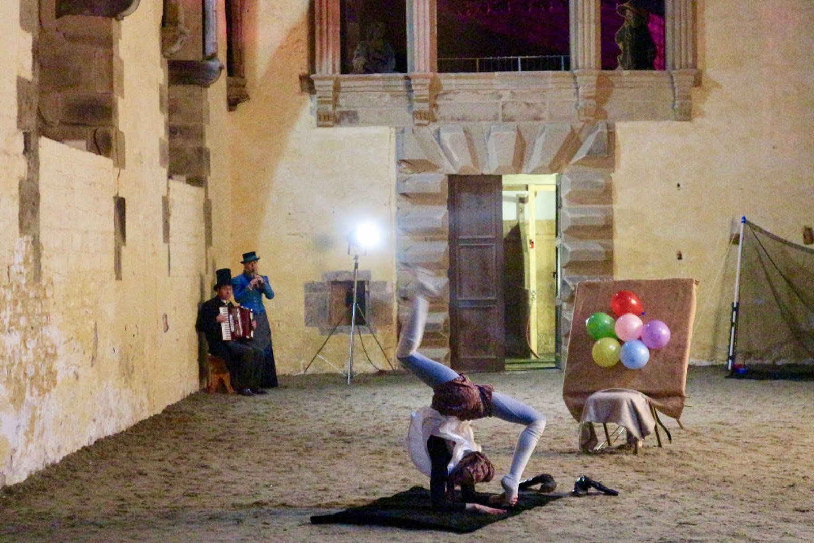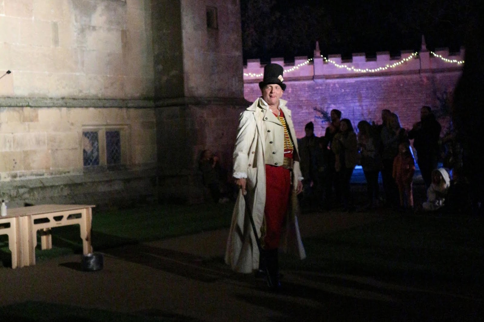 This event held different performances in different locations in the castle. This was great as it meant that some were in slightly warmer indoor areas and some enjoyed the atmospheric backdrop of lights colouring the castle walls. We arrived slightly after the event had begun due to a large traffic accident and diversion so I would have benefitted from one of the events staff just letting us know where the performance was actually taking place at that time. After we joined the first performer in the courtyard area, we were guided by ‘the Ringmaster’ as to where the next performance would be taking place so that was really helpful! Since we arrived a little late, there was a significant crowd around the first act who was a Jester who also breathed fire. It was a real shame as I missed most of his performance in my seated position. Perhaps if English Heritage had a section where prams or wheelchairs could pull into and still see then that would be great for future events. Saying that, the Jester was absolutely amazing! He had the whole crowd in stitches with his slapstick comedy routine. The children in particular were really enjoying his performance. Whilst standing on stilts, the Jester asked for audience members to aid in his comedic routine and also breathed fire!