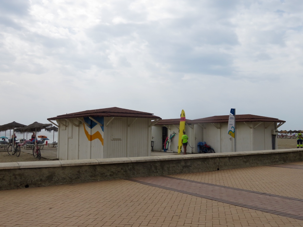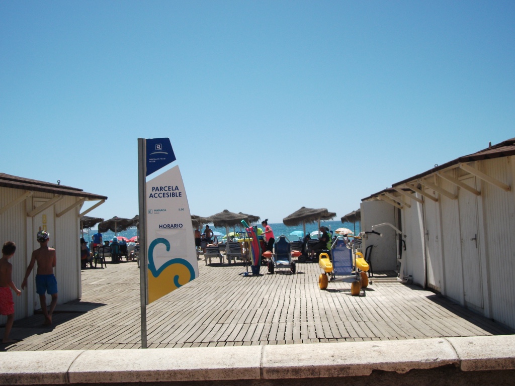 This ‘parcela accessible’ is located in Fuengirola by beach marker 16; you can follow the signed markers down the seafront easily or make use of the many disabled parking bays opposite to this area. The area is fully covered in wooden boarding so you can wheel a normal wheelchair onto the area and down the walkway which almost reaches the sea. There were two beach buildings; one which contained a male and female disabled accessible changing room/ toilet and the other which stored the access equipment and served as an office for the lifeguards on duty. There were shower facilities by these beach buildings that anyone could use to cool down or wash off salt and sand.![]()