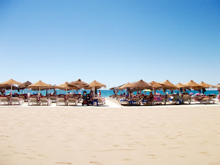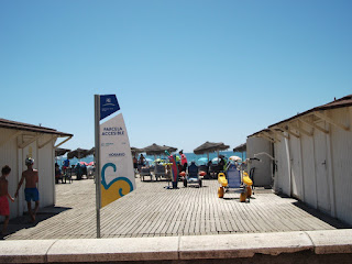 For five euros you get a cushioned sunbed, a grass parasol and the aid of the lifeguards who patrol the area. These lifeguards or ‘socorrista’ are really helpful and during high season (mid June – August) they will even help the disabled to enter the sea by using the specialised amphibious beach wheelchair. This has inflated tyres which allows the lifeguards to push the chair over the sand and into the sea. The arm-rests allow the chair to float in the sea so the wheelchair user can either choose to remain in the chair under supervision of two lifeguards or can transfer into the sea with foam floats (noodles/ woggles) around them to aid swimming. We visited at the start of July and three lifeguards were stationed in this area and whilst you were in the sea one lifeguard either remained in the water with you or if you chose to enter with a companion they were constantly checking on you to ensure you were safe. This is such a fabulous experience for disabled individuals who may have not been swimming before or for a long while – a real plus point to add to your checklist for a sunshine disabled holiday. Specialised crutches with wide bases are also available for those who need walking sticks or crutches to make their way over the sand. ![]()