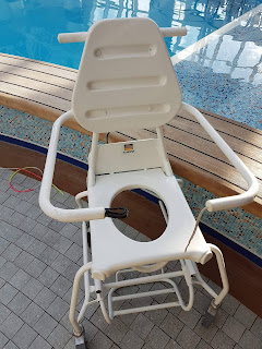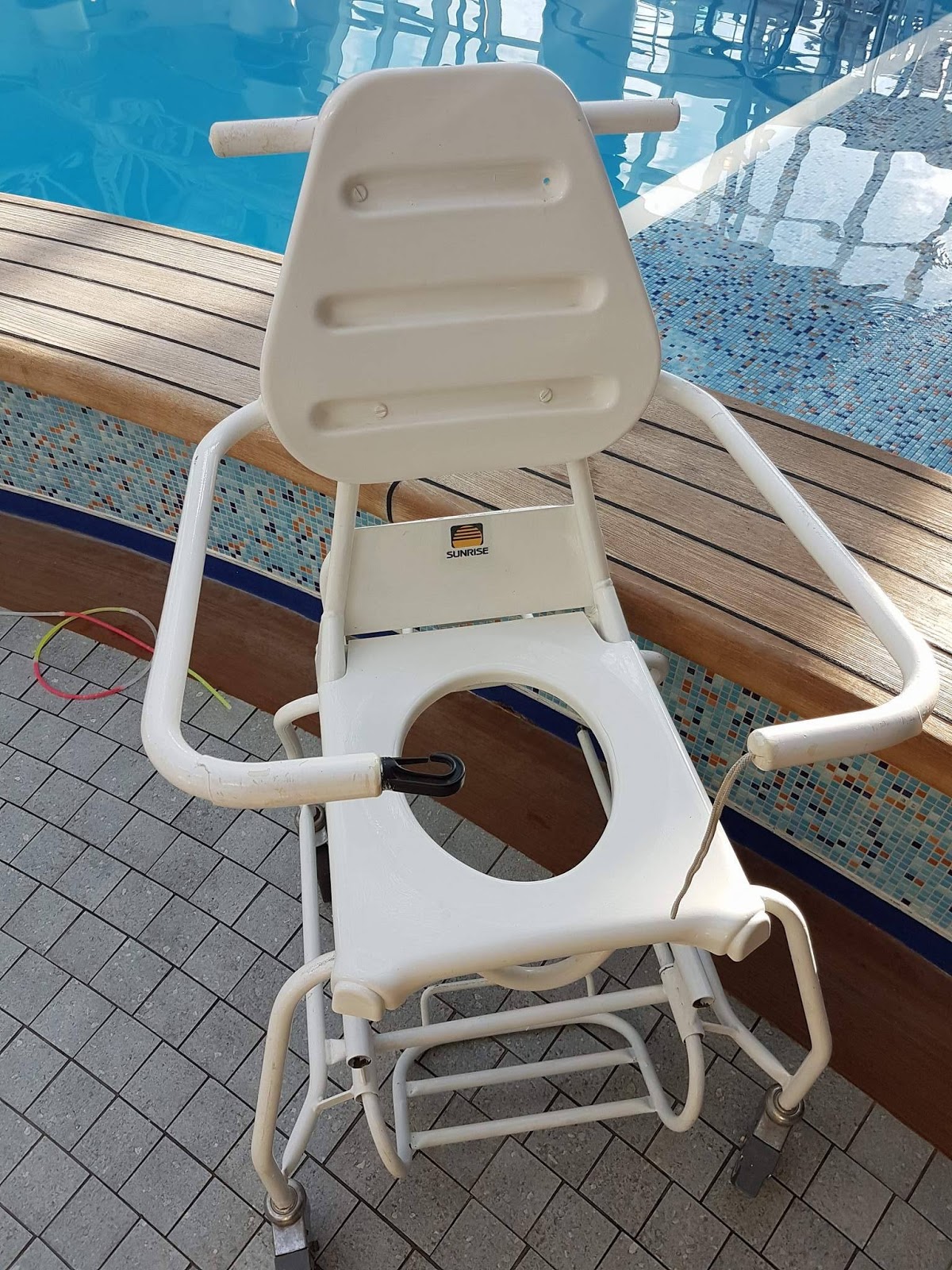 There are multiple pools on Ventura for able-bodied and disabled cruise passengers and some are adult only whilst some allow under 18s in. This includes the Oasis (paid entry spa) pool which has eight steps to enter. Access for both adults and under 18s is permitted to the Laguna outdoor pool which has seven steps, the Beechcomber pool with a hoist (as detailed below) and the outdoor Terrace pool. Children have access to the smaller Plunge pool (four steps and a ladder) and Splash pool (one step and a ladder). Although, poolside help if available for both able-bodied and disabled P&O cruise passengers during high summer season. More details of the Ventura pools are below. The Laguna Pool is the largest of the pool areas and is in the centre of the ship. This pool is open-air and has no cover. It has a shower area attached to the pool to rinse that sweat and suncream off before entering the pool. The big problem with this pool is that there are three tall steps to climb or a short wall raised around this area that people sit on to watch their children play. This is a lovely pool area to relax by since they have music playing at most times and live music and quizzes at the times specified in your Horizon daily newspaper which is delivered to your cabin. Obviously, if your mobility is good then you can climb these steps with no problem but otherwise this is just a nice area to relax in.