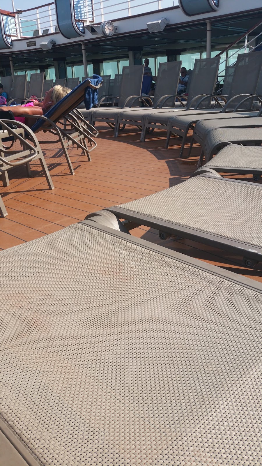 This is part of the fun of a cruise as it allows you to relax in the sunshine. These areas are particularly busy on sea days when the ship isn’t in port so make sure to grab your sunbed early enough! There were signs everywhere that sunbeds can’t be reserved whilst out of use for thirty minutes or more but this wasn’t particularly enforced until late in our cruise. They added a cardboard tag to out of use chairs and then removed belonging off of chairs to a table at the back of the sunbed area. Sunbeds in all areas are particularly difficult to access for people in a wheelchair since they are placed too close together often for a chair to be wheeled through. You could often only access certain beds where there were openings between beds. On deck 14 we often found that sunbeds could only be got onto from the very base as they were situated very close to each other which is fine if you can easily “shuffle” up from the base but is a problem if not.