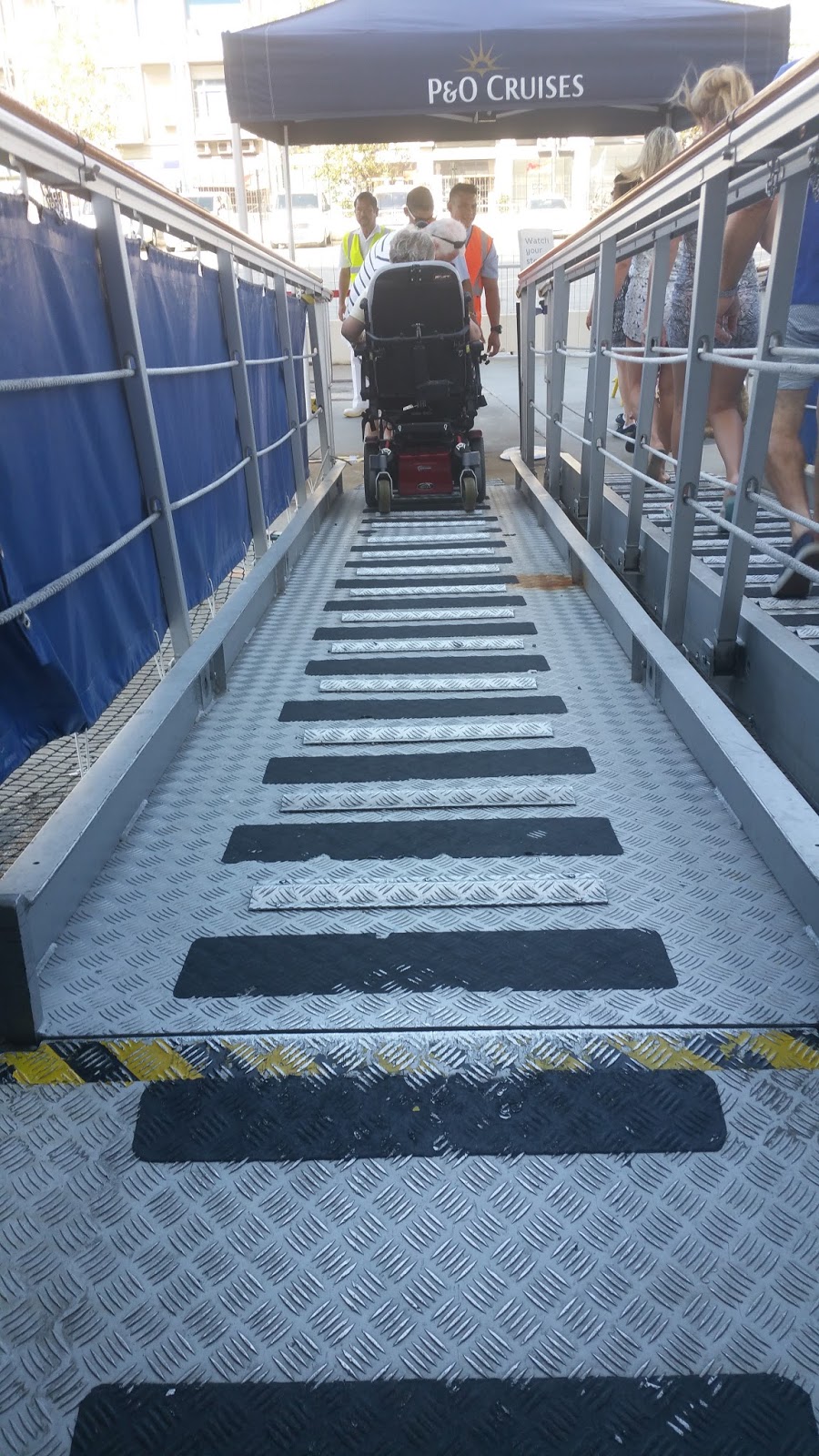 It’s definitely worth asking for a disabled cabin if you struggle with these steps. Disembarkation and TenderingThe tannoy system which announces your arrival into port is really helpful for disabled cruise passengers as it announces a special gangway for passengers with reduced mobility. This is helpful because it is slightly less steep than the “normal” gangway. I found disembarkation hard due to my nerve damage as you were bounced down raised ridges that were put in place to stop the wheelchair from running away from itself. The design hurt me a lot but made sense to safely disembark. Sometimes a large cruise ship can’t fit into smaller ports so P&O cruises use “tenders” which are the smaller lifeboats that ferry you to and from the port. You have to pass a mobility assessment to tender when you get on the ship (the place and time is delivered to your cabin at the start of the cruise). This mobility assessment shows you can climb steps and step over a gap of 45 centimetres or 18 inches. If you are a child you can be carried over this gap.