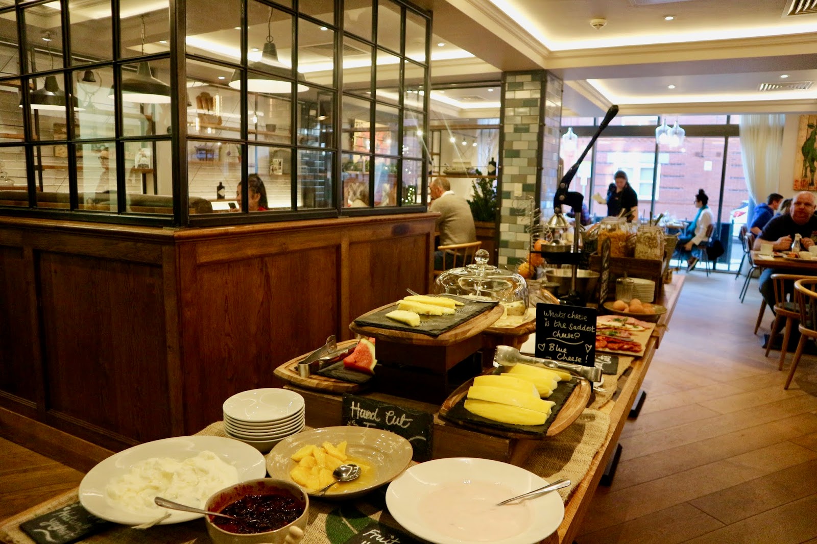 After attending the very festive service at York Minster and going out for evening dinner (a post on this will be up later this week), Richard and I had a wonderful night of sleep in the comfy bed. The breakfast in the morning was served in the same space that houses the No88 Walmgate restaurant that is open from midday until 10pm serving traditional Yorkshire dishes but also innovative dishes with culinary flair. This dining area is large and well-lit; extra sparkle was also added with the festive decorations on display. We were showed to our table and found that I could easily access all areas of the dining area easily, including both sides of the large buffet-style breakfast table in the centre of the space. There were a variety of different table number sizes for different groups and the restaurant area was being cleaned regularly by the waiting staff. The modern decor and light, airy space all added to the leisurely feeling of a city breakfast (plus I loved that breakfast ran until 10.30am so I could have a lie-in!).
