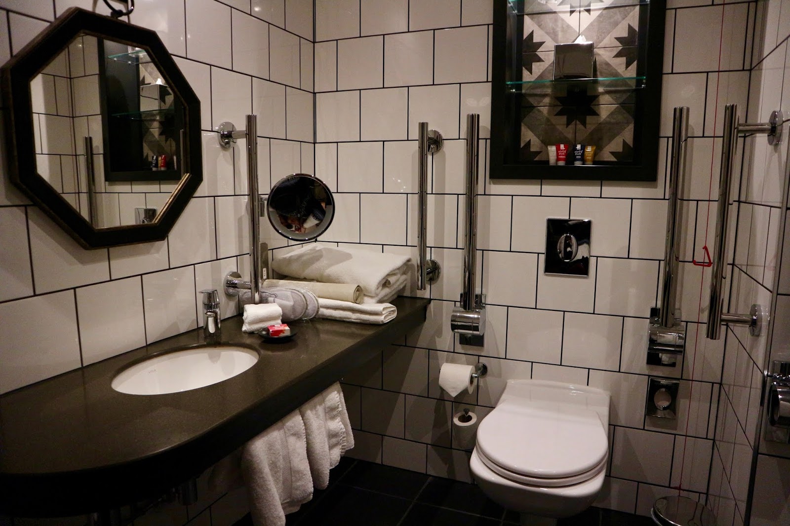Another great feature of the Hotel Indigo accessible room that we stayed in was the wet room bathroom. There were two red alert pull cords; one by the toilet and one in the shower and both of these reached the floor so could be easily accessed if you had a fall in the bathroom so this was brilliant. The toilet was surrounded with adequate grab rails so I could easily transfer and the sanitary bin was within easy reach of the toilet. The shower was really warm and powerful – very relaxing after a day walking/ wheeling around York! I liked that there was a shower seat if you needed to use one but that it folded up against the wall if you didn’t have additional mobility requirements or if your able-bodied carer/ partner/ friend was using it. There were high-quality complimentary shower products from a Yorkshire skincare company which was a lovely touch. The sink was at the perfect height for me to use it when seated in my WHILL C but I found the mirror slightly high unless I was standing but there was a pull-out shaving mirror that I could easily angle to my seated position.