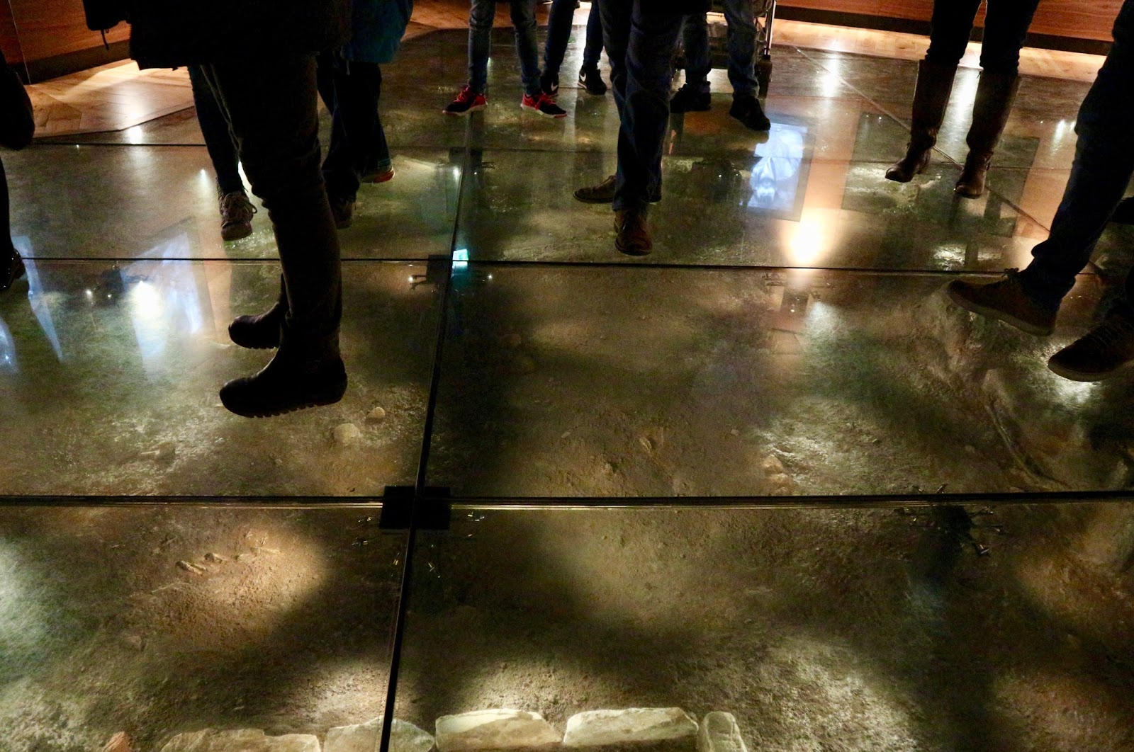 Upon exiting the lift, you come to a medium sized room with a glass floor. Underneath, you can see a reconstruction of where artefacts were found when the area was originally excavated. There are interactive screens and a staff member regularly gives a short talk on the finds displayed beneath the glass.