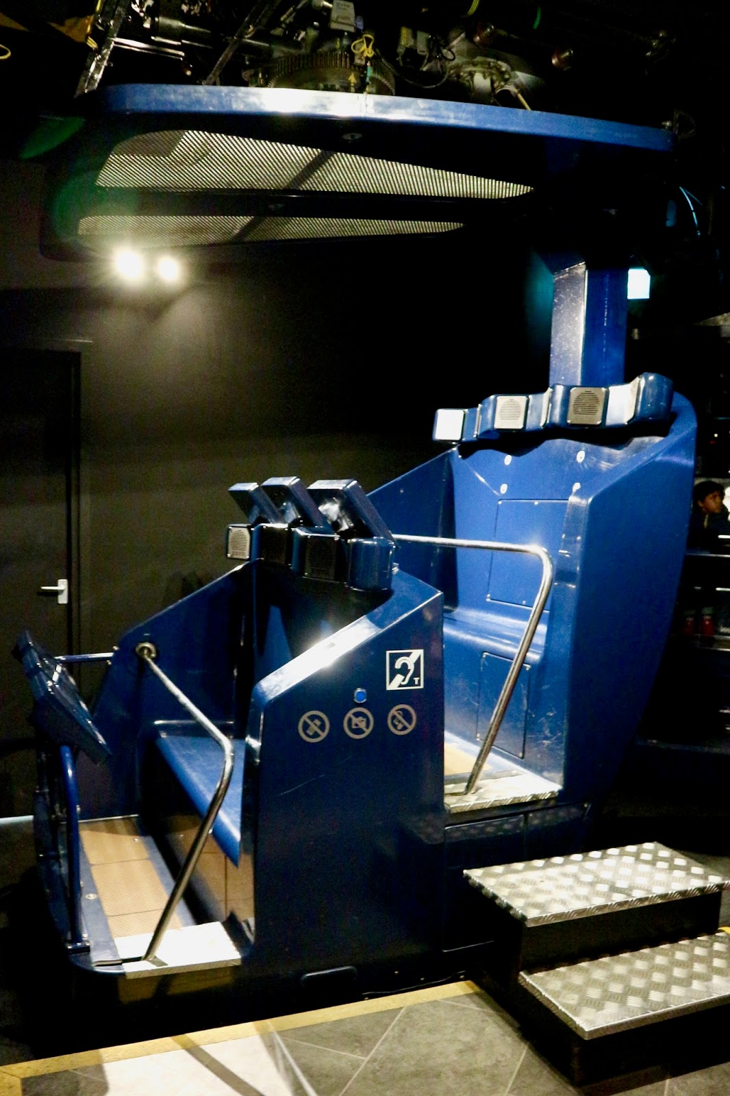 In this area is also a disabled toilet which is accessible by a RADAR key. You can buy these easily off of Amazon if you are visiting the UK or don’t have one yet. Although, usually businesses have a  spare RADAR key if you have forgotten yours or don’t have one. A staff member will help you on from this area if you have a physical disability that means loading on a ride will be difficult. Make sure to talk to the staff if you or your companion will struggle with queueing at all also as there is normally a short queue to board the immersive Viking ride. The usual carriage is pictured below which has one shallow step to board the front row or three slightly wider steps if you are to join on the back row. We used the mobility assistance carriage where I was wheeled onto a special movable platform in my wheelchair, applied my brakes and  then the platform was wheeled onto the ride by a staff member. I would really advise you booking in advance or speaking to the JORVIK staff prior to visiting as only one wheelchair user is allowed in the building at a time so there could be high demand particularly in UK holiday periods.  This boarding process went very smoothly and there were very few jolts for me (who suffers with severe nerve pain so struggles with abrupt movements). My two parents and my sister could board normally at the back of the ride and were in the same carriage as me. Once the platform was locked in I was given a pair of headphones since the built-in seat speakers by your ears were not present in the wheelchair carriage and my touch-screen information monitor was swung around so I could see it to my right hand side.