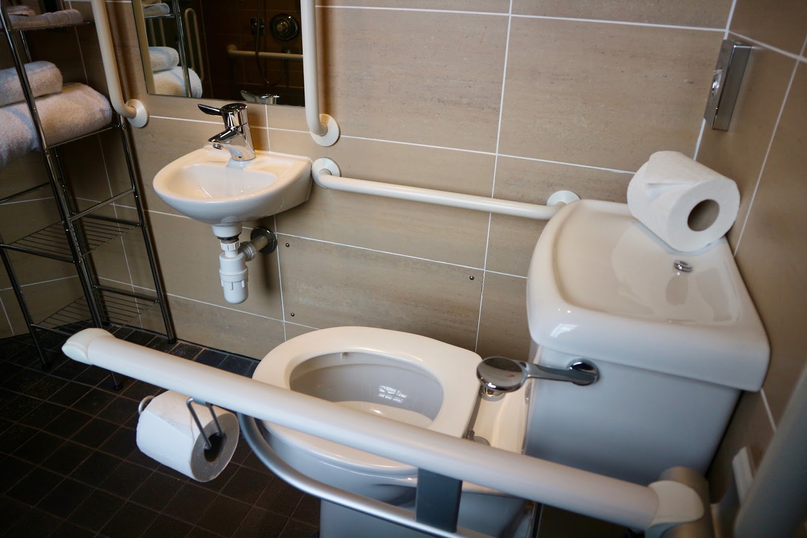 The bathroom within the room was a wet room so fitted with the disabled access hotel Sheffield advertisement which was nice. There was a fold-down seat in the shower and grab rails around the shower seat and toilet. There was a shower mat rolled up and provided too in case you were unsteady on the tiled floor. As in the bedroom, the bathroom had a red pull-cord which was a great relief for me in case I needed it. However, I would have liked this to be unwrapped so it reaches the floor when a Sheffield accessible room has been booked by a disabled guest! I also would have liked a toilet brush and air freshener as a reassurance for guests with GI issues. The toiletries were in quite small bottles for two guests sharing a room but smelled delicious! The towels were nicely folded in a stack and there was a makeup/ shaving magnification mirror which was adjustable which was nice for me at wheelchair seated height. There were water glasses available for me to take my medication.