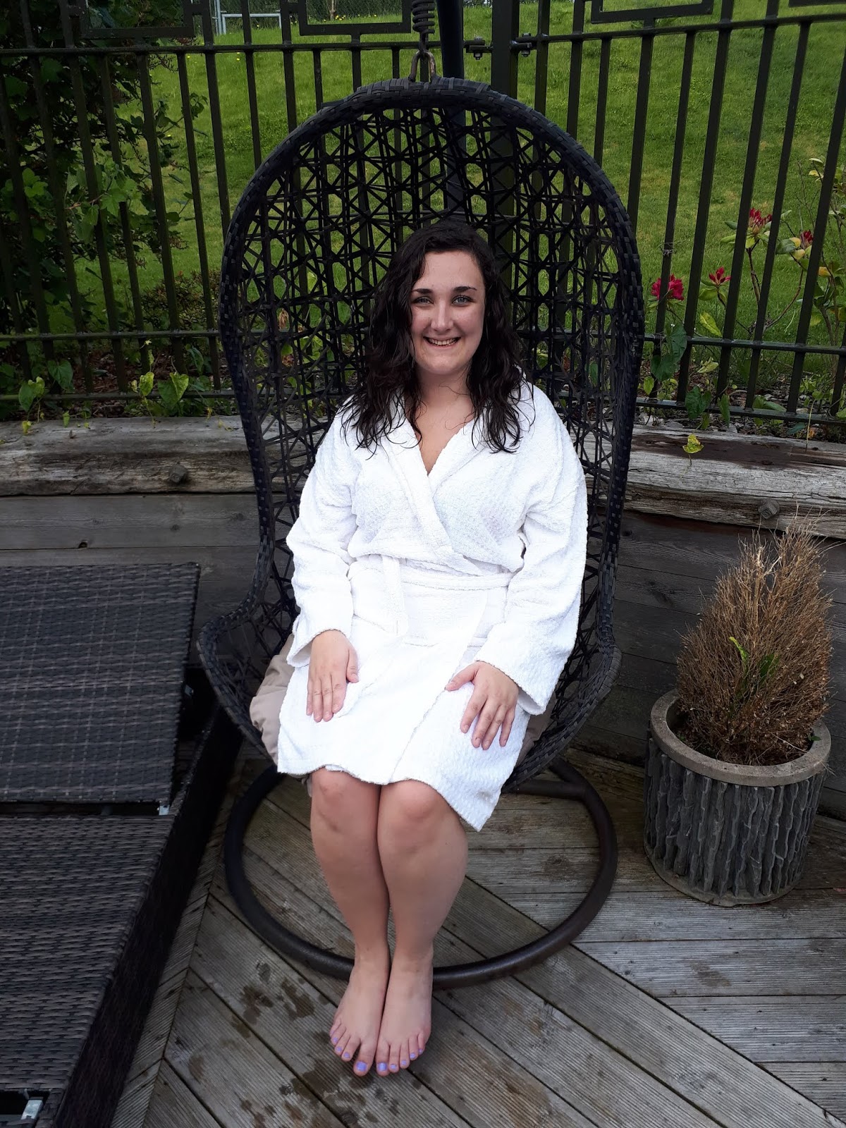Outside there was a picture-perfect exterior spa area. There were sun loungers throughout this area. The cushions had been moved to a central storage area and some had marks on but this would be usual for cream cushions that are used outdoors. There was also a wicker basket chair that could swing or bounce (see the picture of me in that below). I loved how calm the outdoor area was and now many groups of people were being social and chatting in small and large groups. There was a lovely mix of age groups so the whole area felt very welcoming.