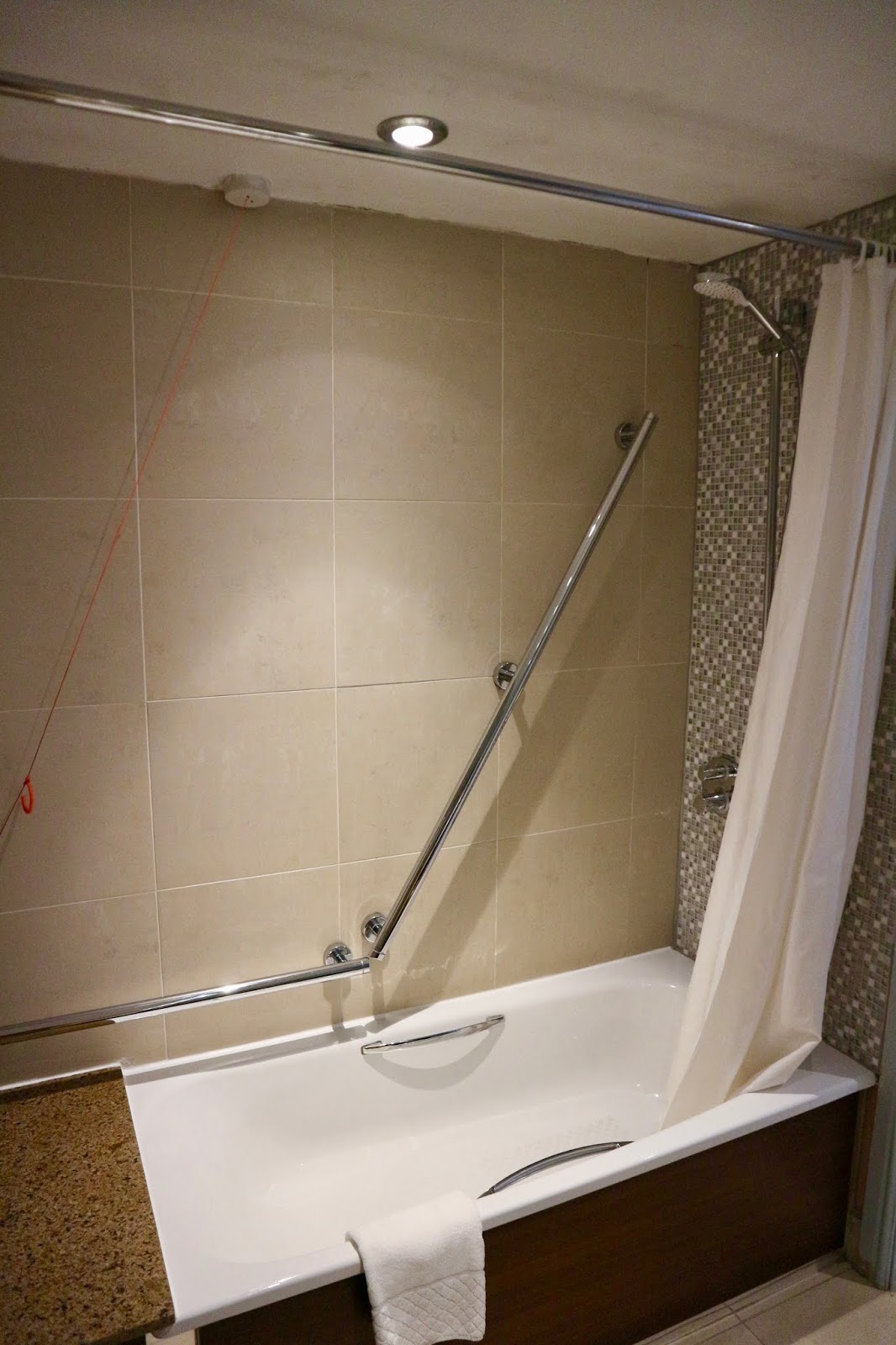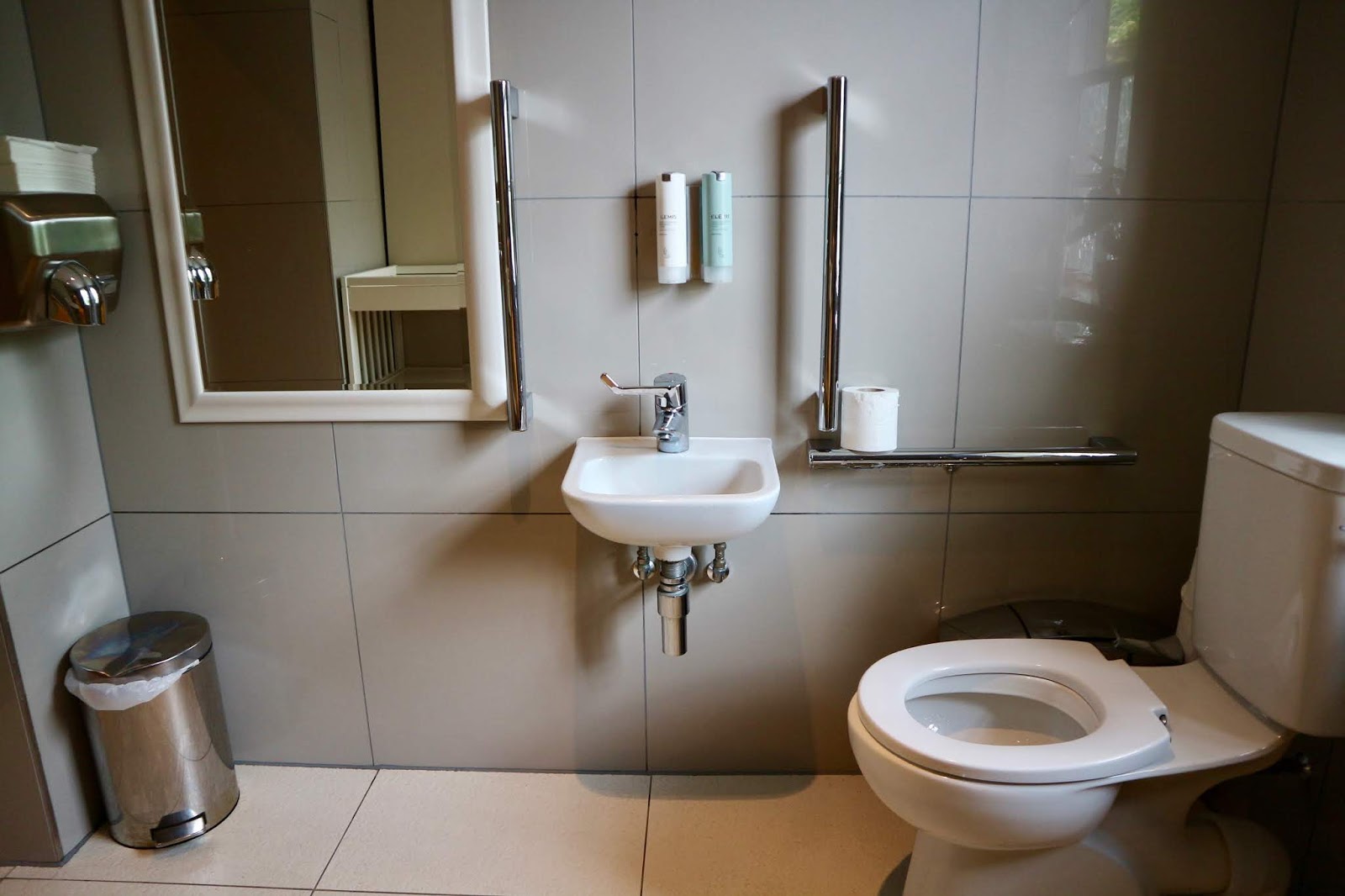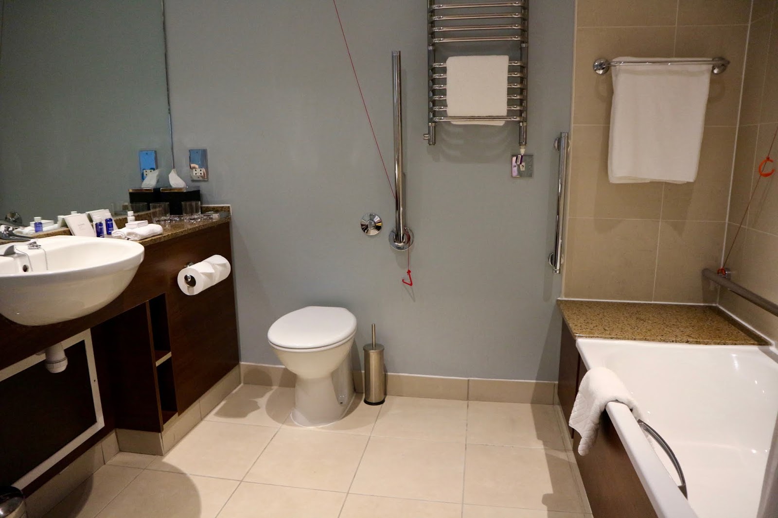 I love seeing red emergency pull cords as these are a brilliant safety net for many people with disabilities. There wasn’t a pull cord by the bed but there was one beside the toilet and within the bath. I only wish that these cords hadn’t been tethered on the grab rails so they reached the floor in case a disabled guest had fallen to the floor. The sanitary bin also needed to be moved to within arms reach of the toilet when a guest with access requirements is using the room.
