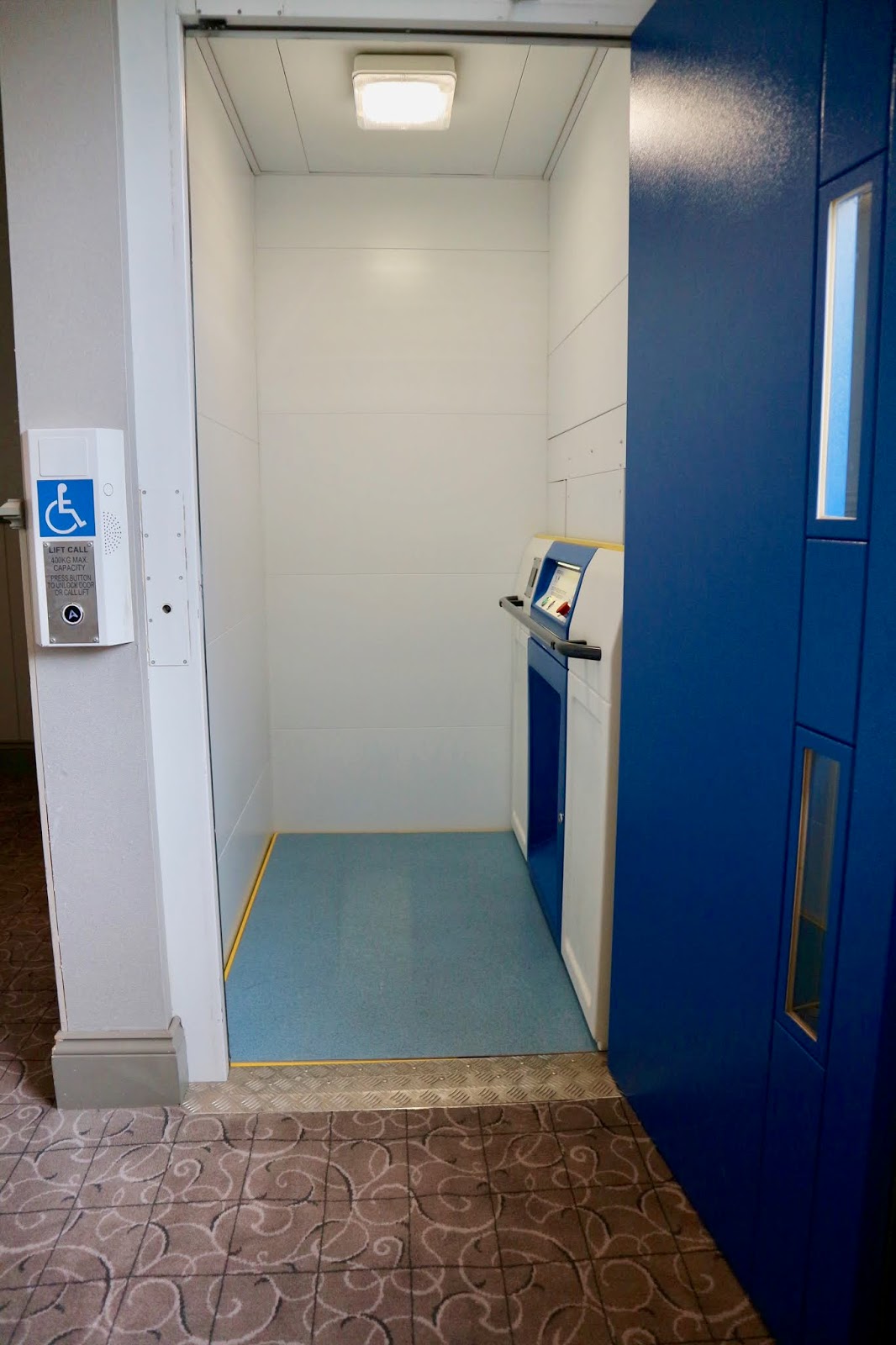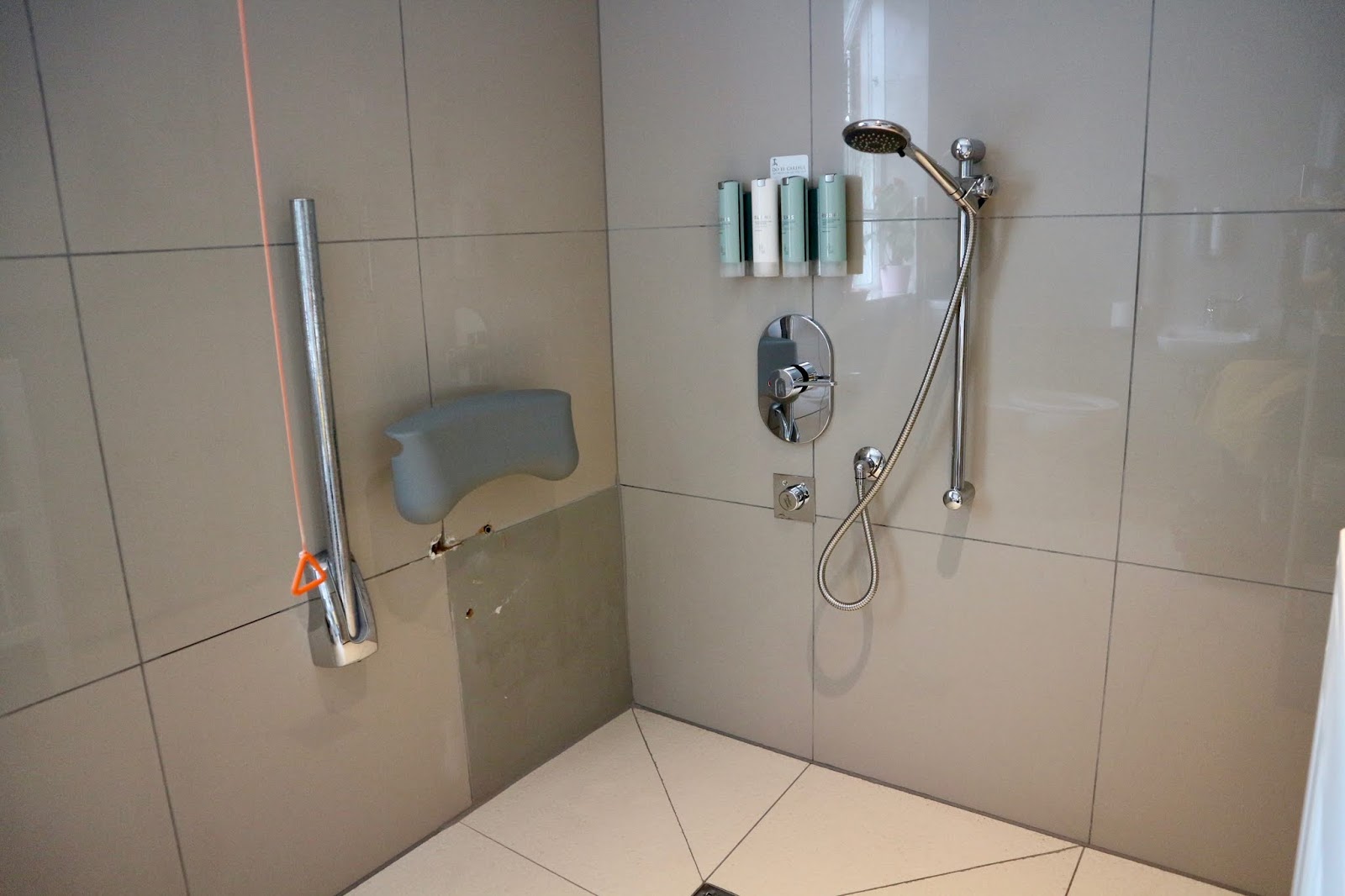 The shower was at a seated height and had many grab rails to use. The shower seat was broken at the time of our visit but will probably be fixed in the near future. There was a red pull cord within easy reach of the shower but this didn’t reach the floor again unfortunately. Large lockers were available to store belongings safely when using the spa and fitness facilities.