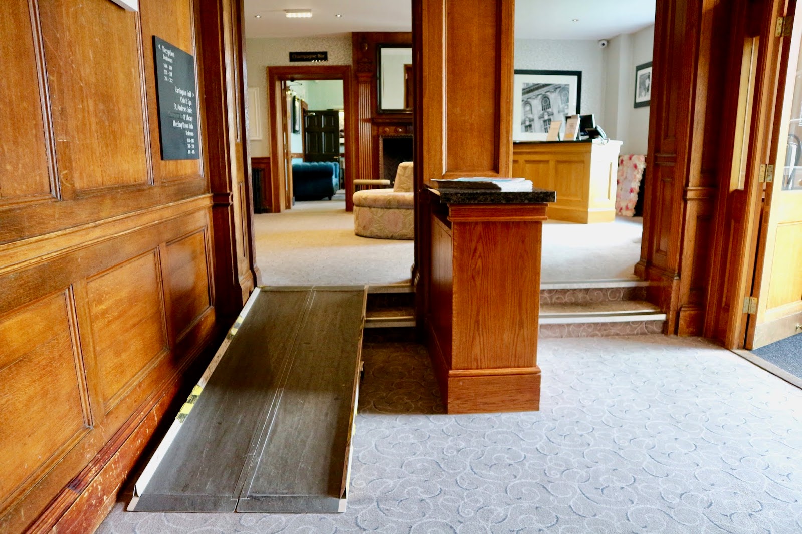 The Reception desk was immediately on your left as you entered the building and we checked in there. The desk was pretty high for me to see over from a seated wheelchair position but Richard checked in for us. On the access statement on the Mottram Hall website (https://www.mottramhall.com/access-statement), it says you can check in from the seated area adjacent to Reception so you could do that if you were a solo traveller who uses a wheelchair. There is a vibrating pillow pad available at Reception for guests who are deaf or have hearing impairments so they can be alerted in the event of a fire alarm during the night – just request this at the desk!