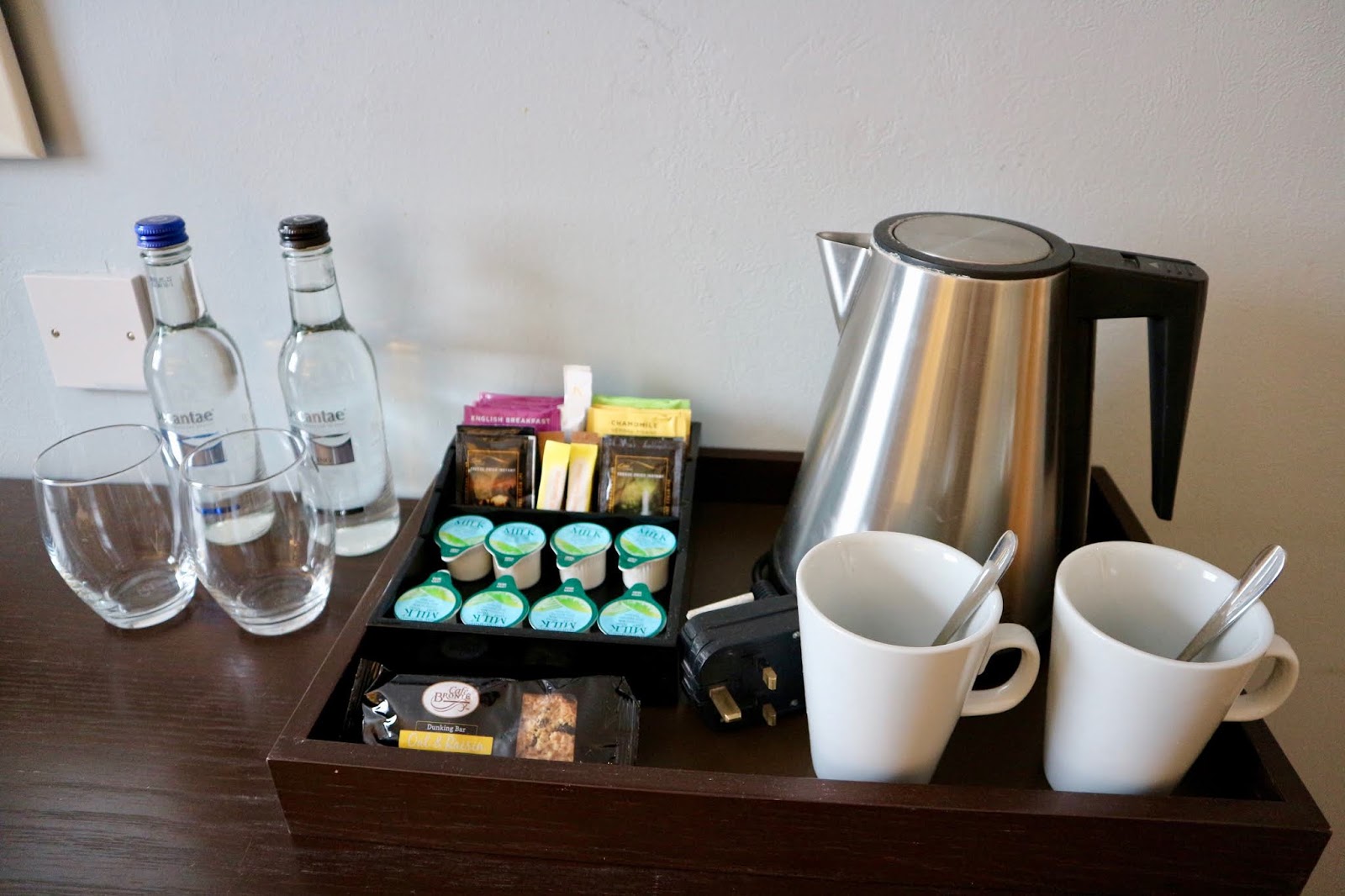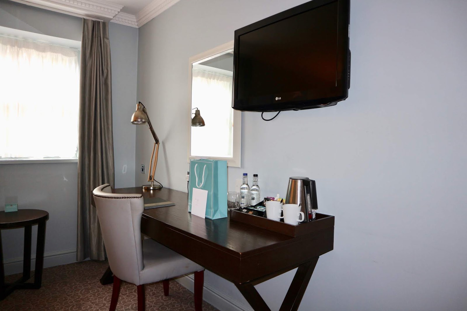 There was a large desk in the room with a desk lamp available to illuminate it. I used this for my makeup when going to the Carrington Grill restaurant in the evening. There was coffee and tea making facilities on this desk with complimentary bottled still and carbonated water and biscuits. The TV was mounted to the wall so we could play music in the evening or watch programmes if we wished. There were full-length mirrors as wardrobe doors with an iron, ironing board and spare bedding if needed.