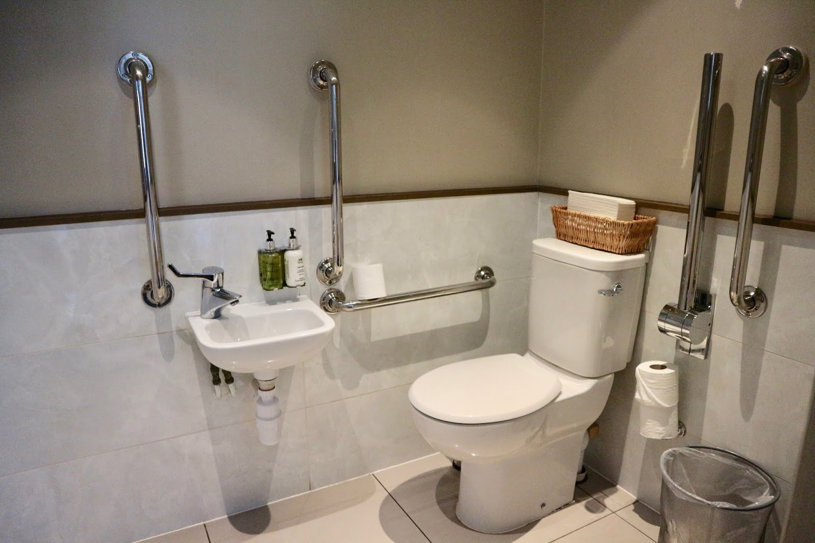 The bathroom had a tiled floor which was easy to self-propel around on. There were Elemis toiletries provided for use here by the sink. The sink itself was lowered so it was at an ideal height for me to use from the wheelchair. The grab handle support rails were really useful around the toilet area and there were also plenty of these in and around the bath to aid transferring. You don’t often see a bath in accessible rooms and this would be a potential problem for many guests with access requirements. However, the staff at Mottram Hall were really upfront about this when we booked so I could analyse whether this would fit my needs. There is a seated shower available in the disabled changing room at the spa if this fits your requirements better – more on the spa further down this page!