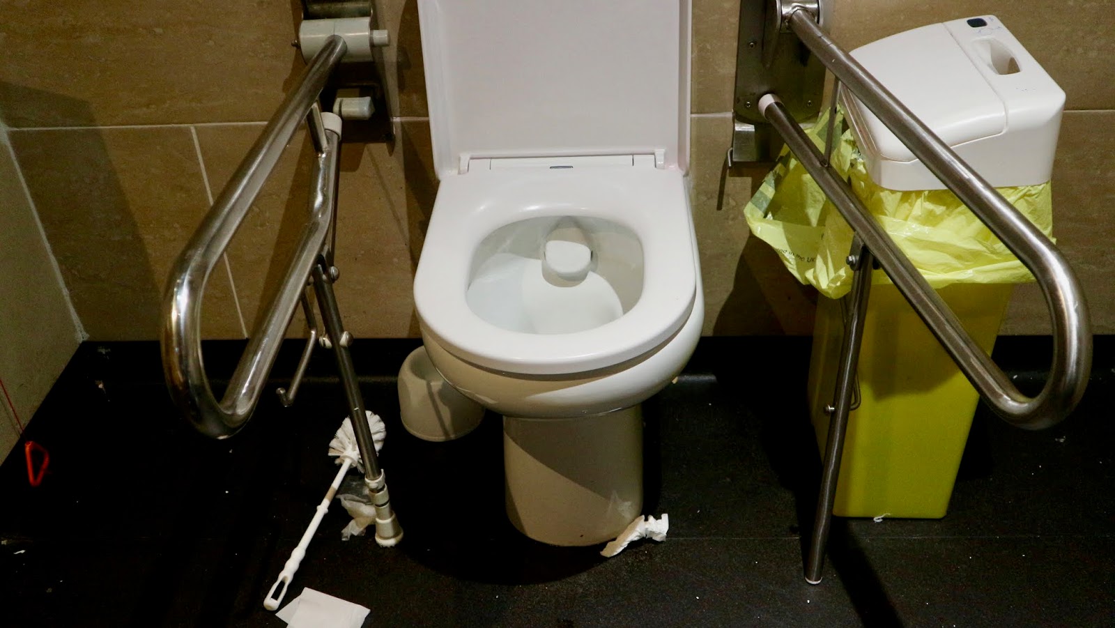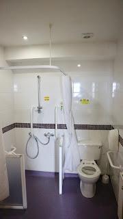The bathrooms were wet rooms with plenty of hand rails to help around the toilet and the sink area. A wheeled commode was available if required. The shower was enclosed by a half height plastic barrier that opened fully so I could wheel my chair right into the entrance. You then pulled curtains around the shower area. There wan’t a shower seat or stool in the shower or attached to the wall but perhaps you needed to ask for this if required from Reception? The bathroom was very clean and I loved the fact that it was a wet room so I could access every part of it. I was a little surprised not to find an air freshener in the bathroom or the toilet nearest the restaurant area as these can often be helpful for guests with GI issues or changing needs. Also, the bathroom bin in the bedroom was placed by the sink rather than the toilet which makes feminine hygiene requirements complicated for a disabled adult. The bathroom cabinet handle kept falling off and one of the bathroom showers had a broken bracket so it had to be held by hand rather than mounted on a pole on the wall.