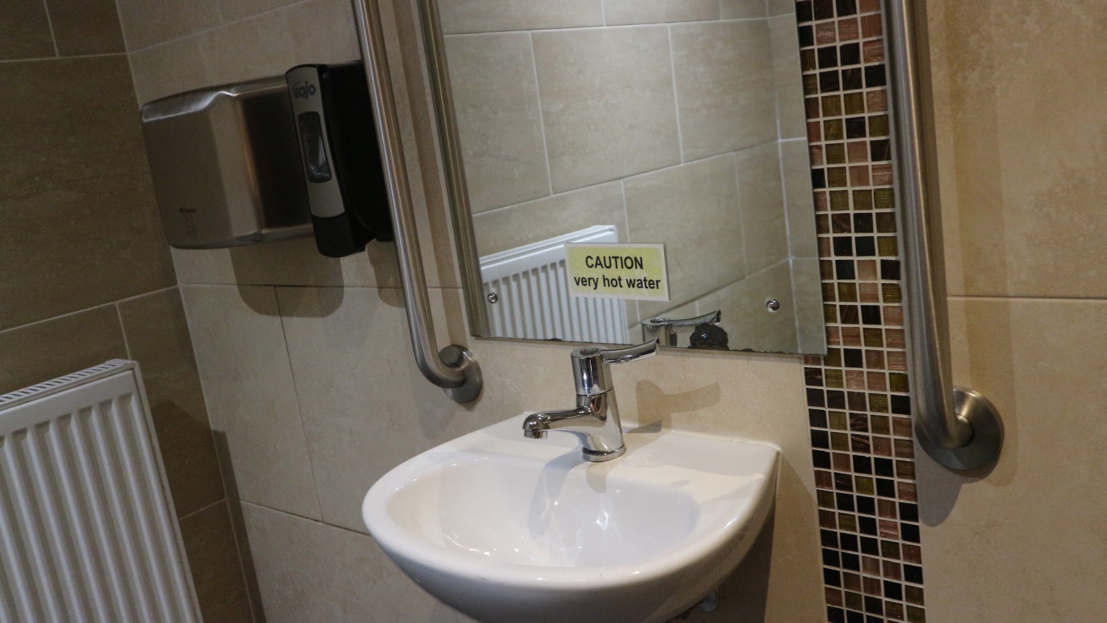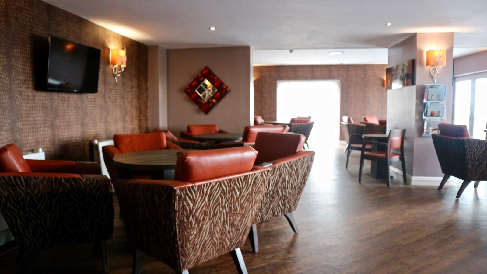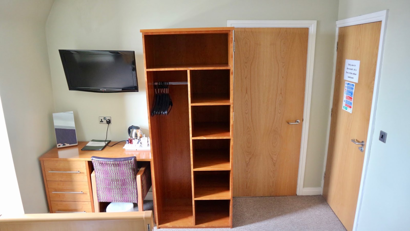 Elsewhere in the bedroom, a wheelchair user had clearly been thought about! The floor length mirror was mounted at a brilliant height so I could check my outfit from a seated position but there was also a desktop mirror on the dresser. The room included a medium sized TV which worked well, plentiful hanging space and drawers. There were also tea, coffee and hot chocolate making facilities in both of the adjoining rooms with some nice biscuits that we enjoyed after our hard journey from home to the hotel! The hotel directory included some really useful information such as telephone numbers for nearby doctors and where to locate your nearest places of worship. The directory stated that the hotel had free WiFi (great!) but didn’t list the password weirdly. There also wasn’t a telephone to call down to Reception which was really unusual. The directory also mentions that ironing boards are available on request which was true but the board cover was highly stained from a previous guest’s use which wasn’t pleasant. The room was of a very generous size and was lovely and clean but had a few DIY issues a maintenance staff member could have easily sorted out!